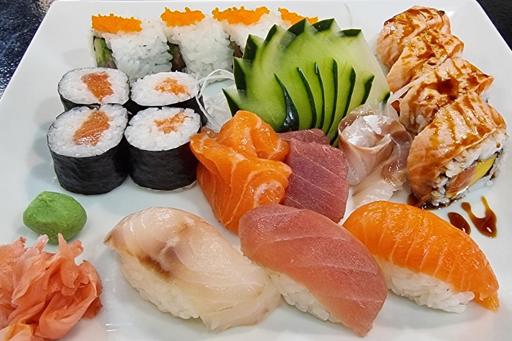 4 ou 8 peças com tempura de camarão, salmão, maçã verde, salmão refogado, teriyaki