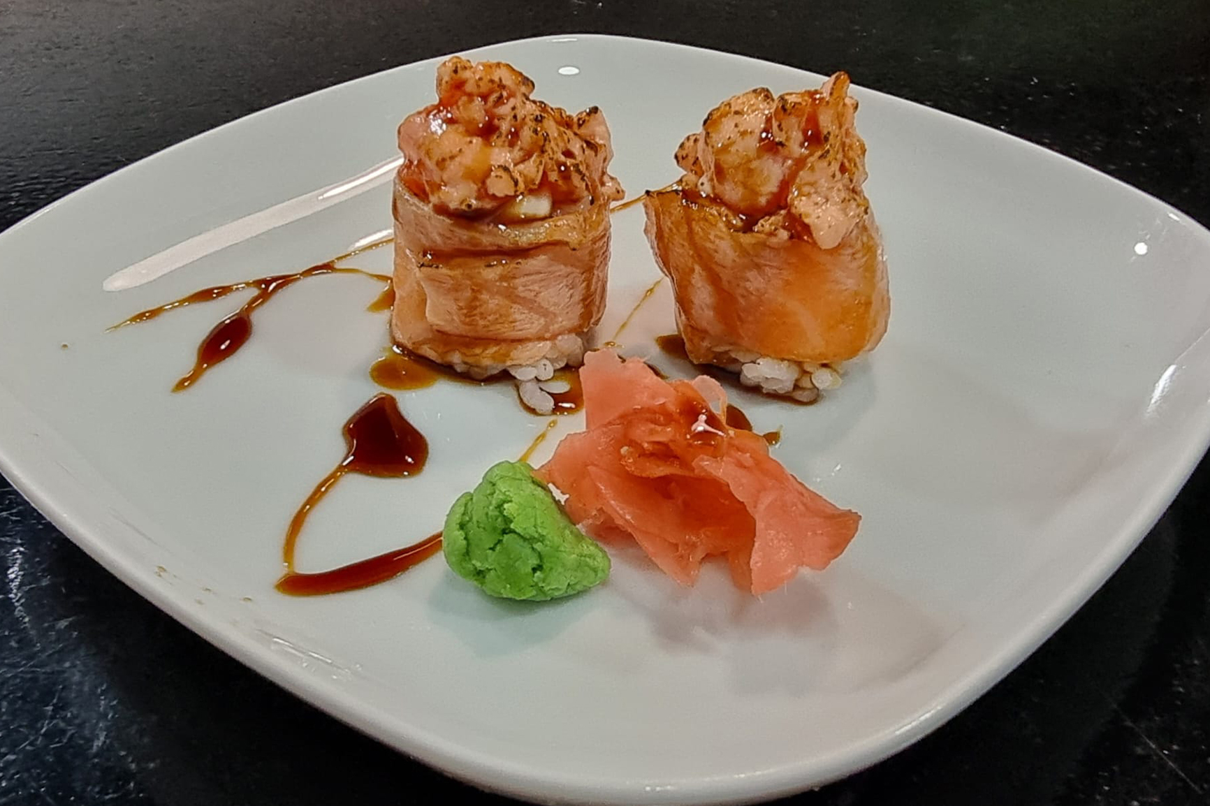 4 ou 8 peças com salmão, abacate, cream cheese, sweet chilli, cebola frita