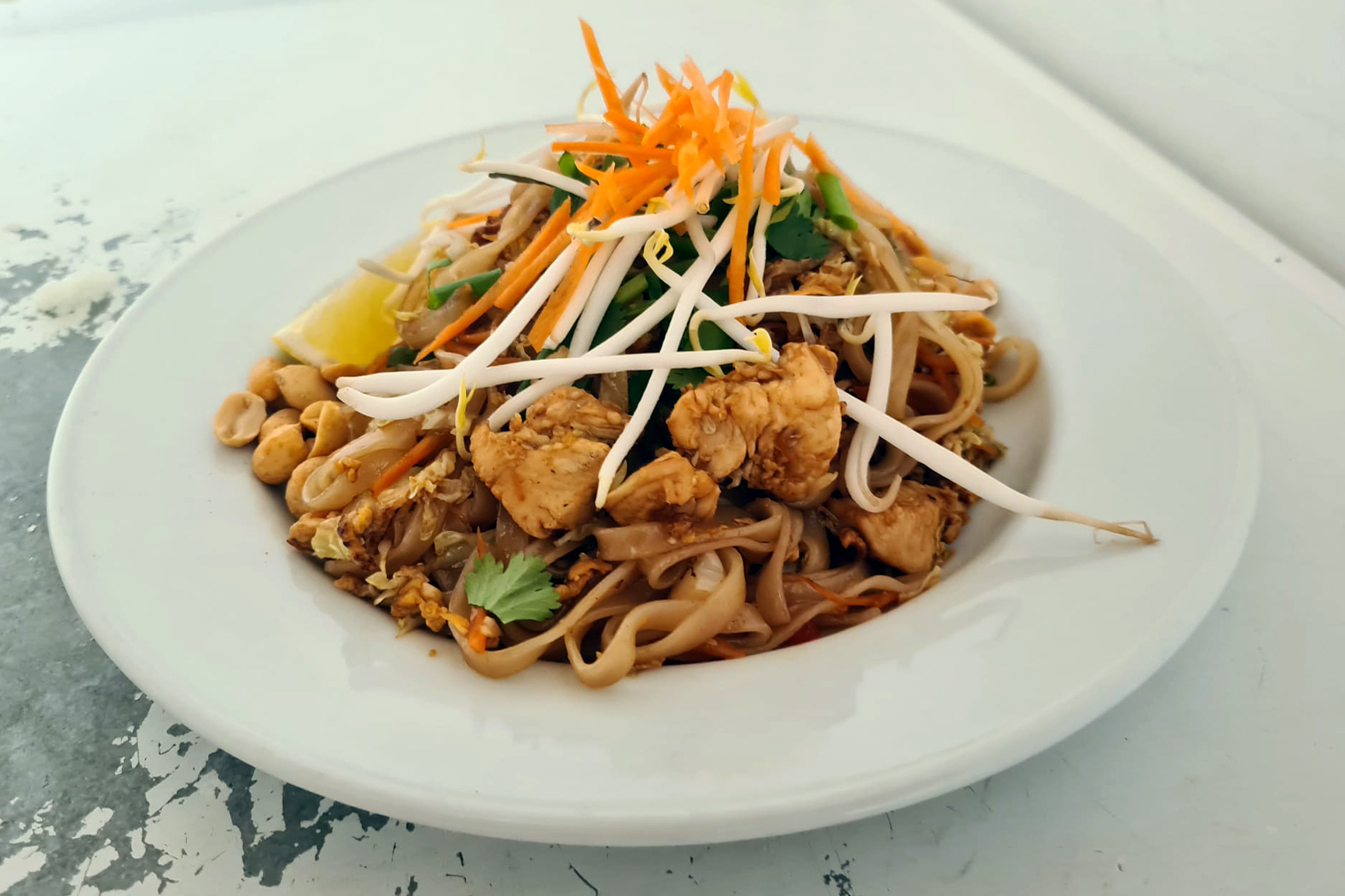 Massa oriental de arroz, salteada com frango/camarão, ovos, legumes, amendoim, limão e molho tamarindo